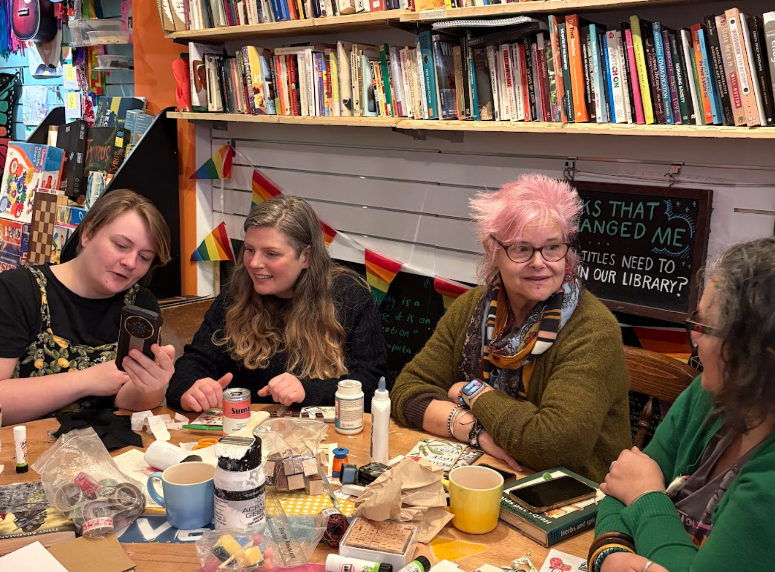[4 participants sat around the round table chatting jovially, with art materials, coffee cups and phones on the table. One particicpant is showing another a picture on their phone]